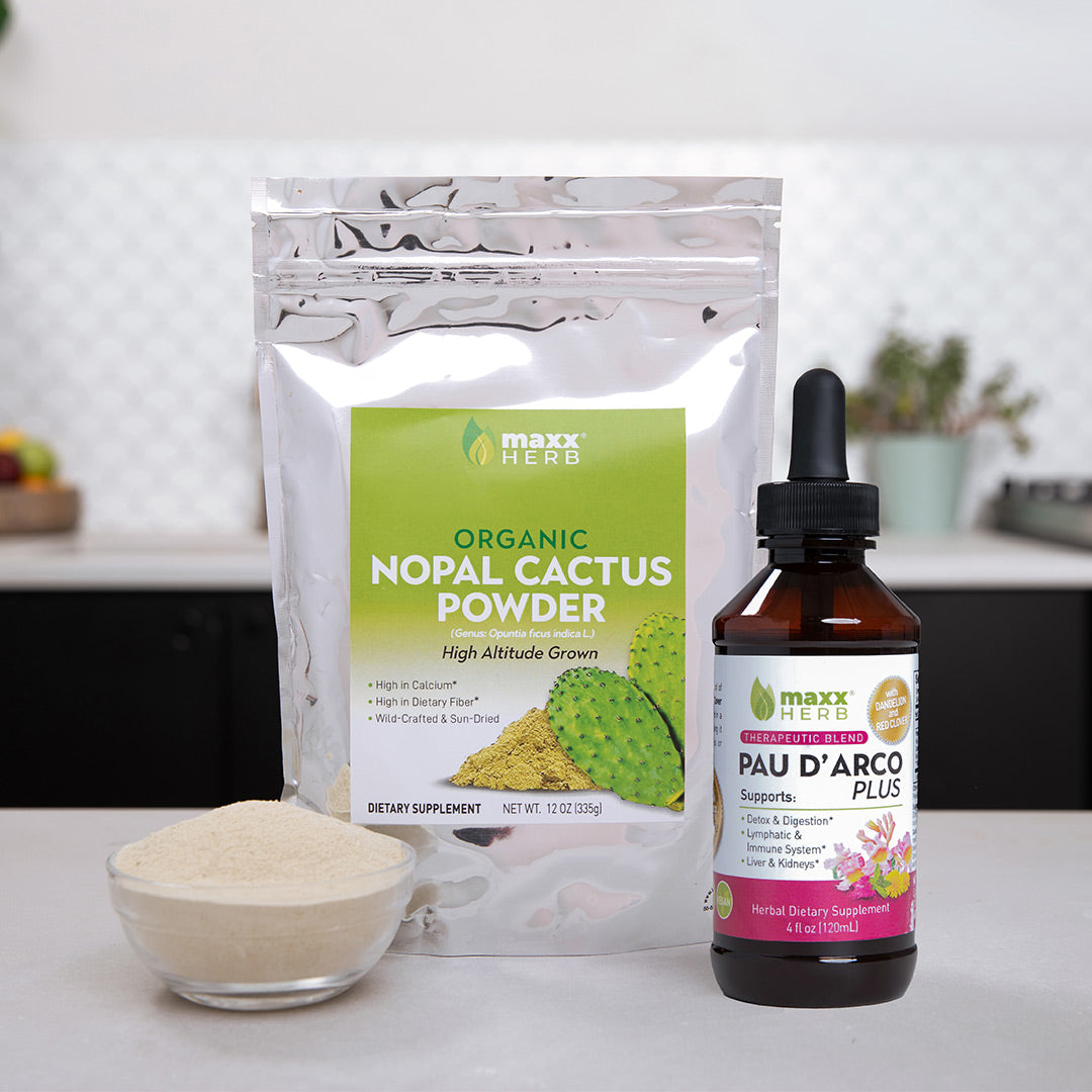 Over time, toxins and impurities can accumulate in your body, weighing you down and compromising your overall well-being. Our Natural Detox Bundle harnesses the cleansing power of Pau D'Arco with Dandelion & Red Clover, and Green Nopal Cactus Leaf Powder to potentially help you flush out harmful substances and revitalize your system.